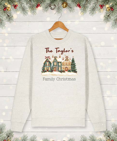 This charming unisex design exudes a cosy winter ambiance, featuring stitch-style text below a row of quaint, snow-dusted watercolor houses—guaranteed to sprinkle a little extra holiday cheer and get you and yours firmly in the Christmas spirit.